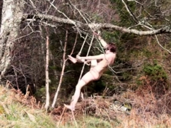 Naked self-bondage in the woods gone wrong.
